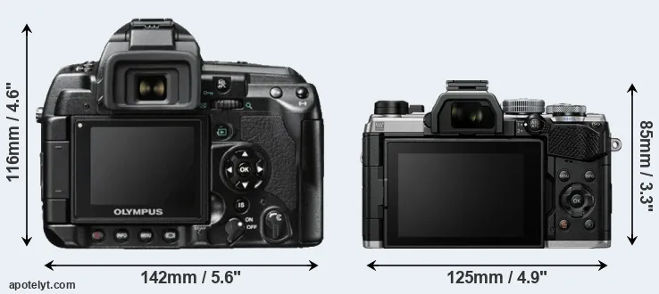 The above size and weight comparisons are to some extent incomplete since they do not consider the interchangeable lenses that both of these cameras require. Both cameras have similarly sized sensors, but DSLRs have a larger flange-to-focal plane distance than mirrorless cameras, which imposes contraints on the optical engineering process and generally leads to bigger and heavier lenses. You can compare the optics available for the two cameras in the Four Thirds Lens Catalog (E-3) and the Micro Four Thirds Lens Catalog (OM-5). Mirrorless cameras, such as the OM-5, have moreover the advantage that they can use many lenses from other systems via adapters, as they have a relatively short flange to focal plane distance.