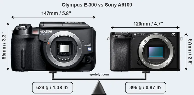 If the front view area (width x height) of the cameras is taken as an aggregate measure of their size, the Sony A6100 is considerably smaller (36 percent) than the Olympus E-300. Moreover, the A6100 is substantially lighter (37 percent) than the E-300. In this context, it is worth noting that neither the E-300 nor the A6100 are weather-sealed.