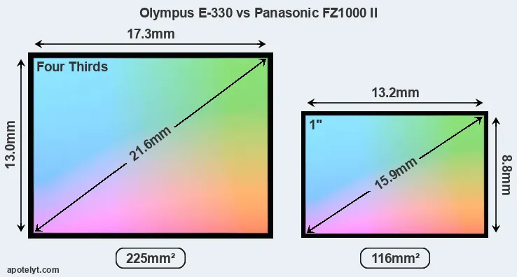 Of the two cameras under consideration, the Olympus E-330 features a Four Thirds sensor and the Panasonic FZ1000 II an one-inch sensor. The sensor area in the FZ1000 II is 48 percent smaller. As a result of these sensor size differences, the cameras have a format factor of, respectively, 2.0 and 2.7. The sensor in the E-330 has a native 4:3 aspect ratio, while the one in the FZ1000 II offers a 3:2 aspect.