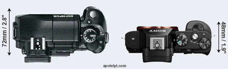 The side-by-side display below illustrates the physical size and weight of the Olympus E-330 and the Sony A7R. The two cameras are presented according to their relative size. Three consecutive perspectives from the front, the top, and the back are available. All width, height and depth measures are rounded to the nearest millimeter.