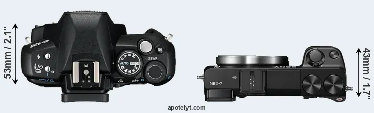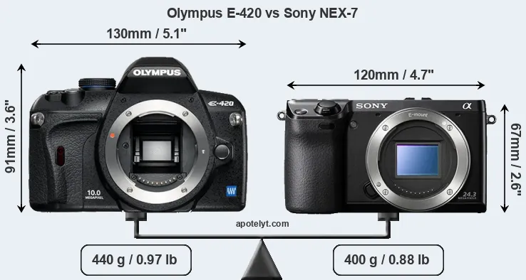 If the front view area (width x height) of the cameras is taken as an aggregate measure of their size, the Sony NEX-7 is considerably smaller (32 percent) than the Olympus E-420. Moreover, the NEX-7 is markedly lighter (9 percent) than the E-420. In this context, it is worth noting that neither the E-420 nor the NEX-7 are weather-sealed.