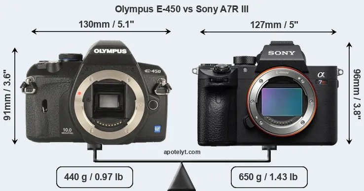 If the front view area (width x height) of the cameras is taken as an aggregate measure of their size, the Sony A7R III is somewhat larger (3 percent) than the Olympus E-450. Moreover, the A7R III is substantially heavier (48 percent) than the E-450. It is noteworthy in this context that the A7R III is splash and dust-proof, while the E-450 does not feature any corresponding weather-sealing.