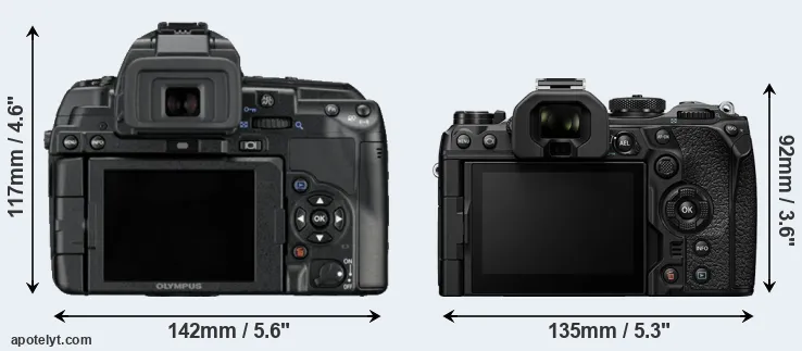 The above size and weight comparisons are to some extent incomplete since they do not consider the interchangeable lenses that both of these cameras require. Both cameras have similarly sized sensors, but DSLRs have a larger flange-to-focal plane distance than mirrorless cameras, which imposes contraints on the optical engineering process and generally leads to bigger and heavier lenses. You can compare the optics available for the two cameras in the Four Thirds Lens Catalog (E-5) and the Micro Four Thirds Lens Catalog (OM-1 II). Mirrorless cameras, such as the OM-1 II, have moreover the advantage that they can use many lenses from other systems via adapters, as they have a relatively short flange to focal plane distance.