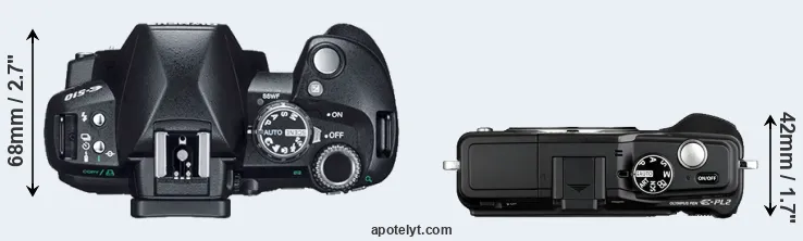 The side-by-side display below illustrates the physical size and weight of the Olympus E-510 and the Olympus E-PL2. The two cameras are presented according to their relative size. Three consecutive views from the front, the top, and the rear side are shown. All width, height and depth measures are rounded to the nearest millimeter.