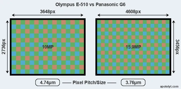 While the two cameras under review share the same sensor size, the G6 offers a higher resolution of 15.9 megapixels, compared with 10 MP of the E-510. This megapixels advantage translates into a 26 percent gain in linear resolution. On the other hand, these sensor specs imply that the G6 has a higher pixel density and a smaller size of the individual pixel (with a pixel pitch of 3.76μm versus 4.74μm for the E-510). However, it should be noted that the G6 is much more recent (by 6 years and 1 month) than the E-510, and its sensor will have benefitted from technological advances during this time that compensate for the smaller pixel size.