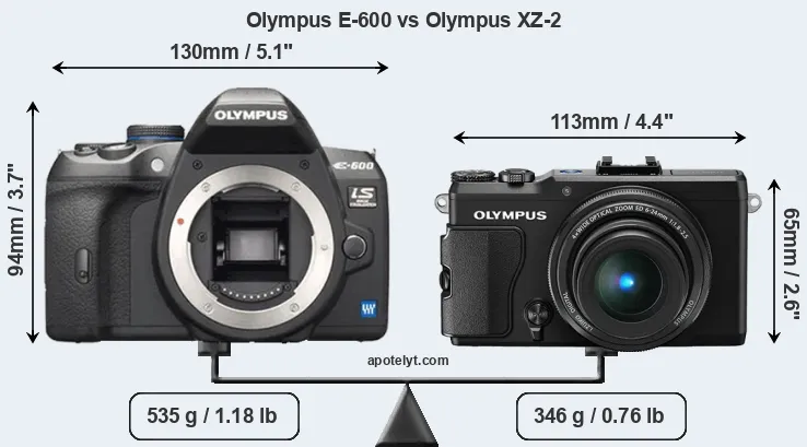 An illustration of the physical size and weight of the Olympus E-600 and the Olympus XZ-2 is provided in the side-by-side display below. The two cameras are presented according to their relative size. Three consecutive views from the front, the top, and the rear side are shown. All width, height and depth measures are rounded to the nearest millimeter.
