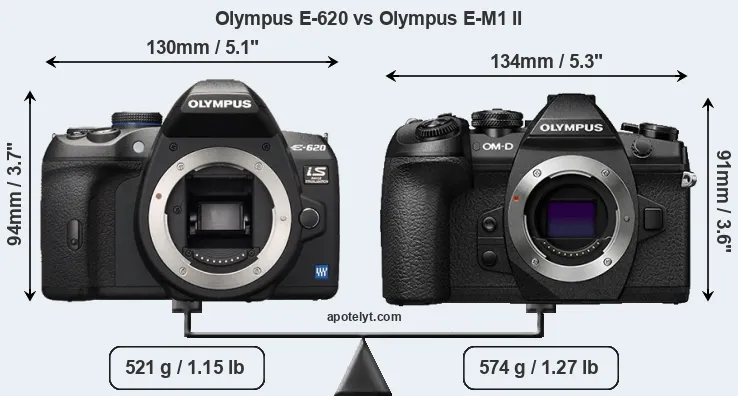 If the front view area (width x height) of the cameras is taken as an aggregate measure of their size, the Olympus E-620 and the Olympus E-M1 II are of equal size. However, the E-M1 II is markedly heavier (10 percent) than the E-620. It is noteworthy in this context that the E-M1 II is splash and dust-proof, while the E-620 does not feature any corresponding weather-sealing.