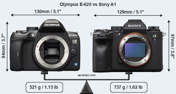 If the front view area (width x height) of the cameras is taken as an aggregate measure of their size, the Sony A1 is somewhat larger (2 percent) than the Olympus E-620. Moreover, the A1 is substantially heavier (41 percent) than the E-620. It is noteworthy in this context that the A1 is splash and dust-proof, while the E-620 does not feature any corresponding weather-sealing.