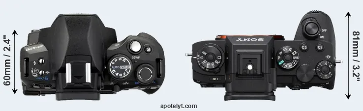 The physical size and weight of the Olympus E-620 and the Sony A1 are illustrated in the side-by-side display below. The two cameras are presented according to their relative size. Three successive views from the front, the top, and the rear are shown. All width, height and depth dimensions are rounded to the nearest millimeter.