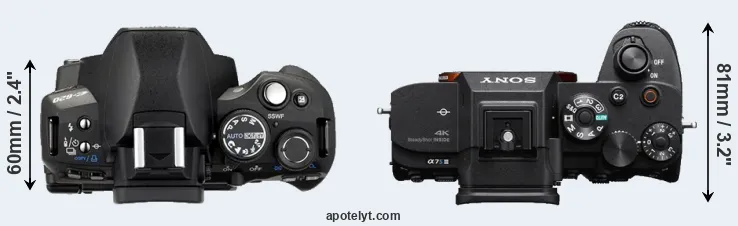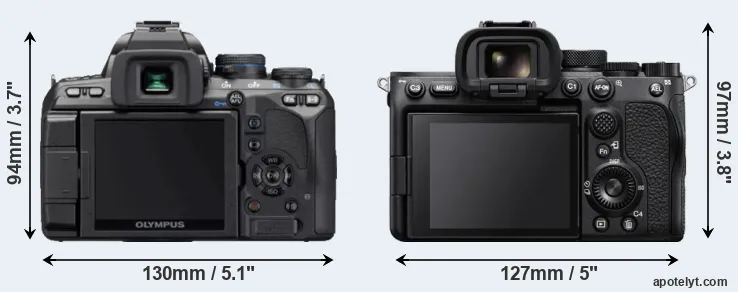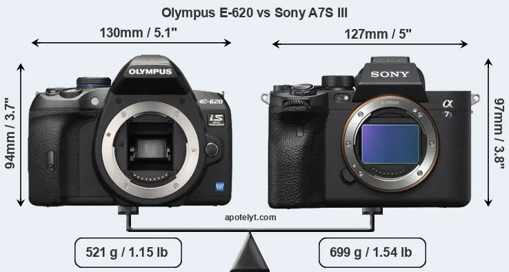 The physical size and weight of the Olympus E-620 and the Sony A7S III are illustrated in the side-by-side display below. The two cameras are presented according to their relative size. Three consecutive perspectives from the front, the top, and the back are available. All width, height and depth measures are rounded to the nearest millimeter.