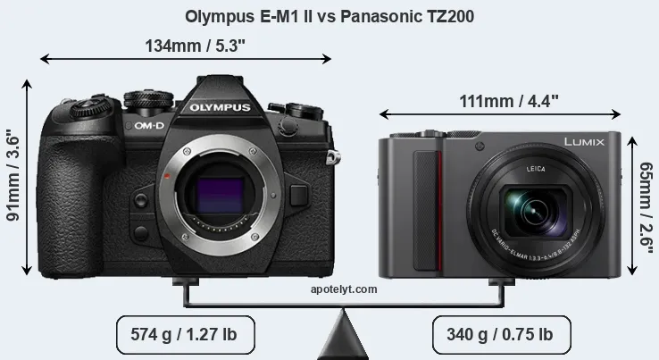 An illustration of the physical size and weight of the Olympus E-M1 II and the Panasonic TZ200 is provided in the side-by-side display below. The two cameras are presented according to their relative size. Three consecutive perspectives from the front, the top, and the back are available. All width, height and depth dimensions are rounded to the nearest millimeter.