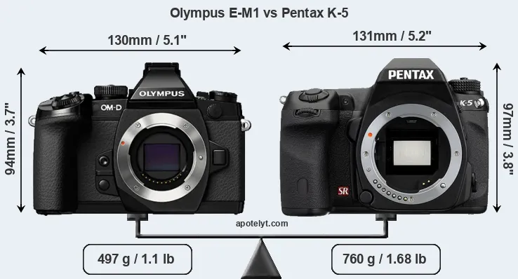 If the front view area (width x height) of the cameras is taken as an aggregate measure of their size, the Pentax K-5 is somewhat larger (4 percent) than the Olympus E-M1. Moreover, the K-5 is substantially heavier (53 percent) than the E-M1. In this context, it is worth noting that both cameras are splash and dust-proof and can, hence, be used in inclement weather conditions or harsh environments.