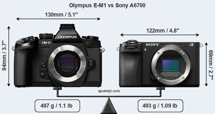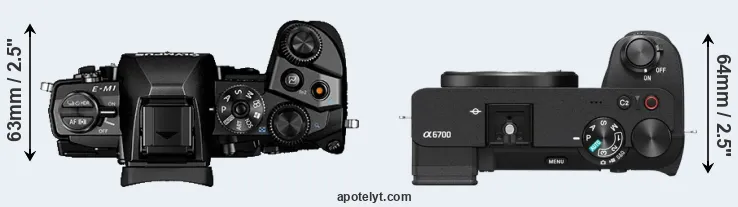 The physical size and weight of the Olympus E-M1 and the Sony A6700 are illustrated in the side-by-side display below. The two cameras are presented according to their relative size. Three consecutive perspectives from the front, the top, and the back are available. All width, height and depth dimensions are rounded to the nearest millimeter.