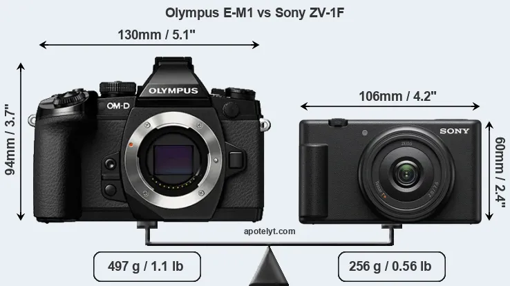An illustration of the physical size and weight of the Olympus E-M1 and the Sony ZV-1F is provided in the side-by-side display below. The two cameras are presented according to their relative size. Three successive views from the front, the top, and the rear are shown. All width, height and depth measures are rounded to the nearest millimeter.
