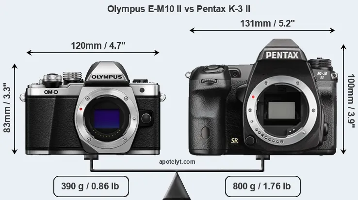 If the front view area (width x height) of the cameras is taken as an aggregate measure of their size, the Pentax K-3 II is notably larger (32 percent) than the Olympus E-M10 II. Moreover, the K-3 II is substantially heavier (105 percent) than the E-M10 II. It is noteworthy in this context that the K-3 II is splash and dust-proof, while the E-M10 II does not feature any corresponding weather-sealing.