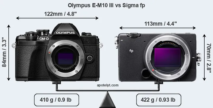 If the front view area (width x height) of the cameras is taken as an aggregate measure of their size, the Sigma fp is notably smaller (23 percent) than the Olympus E-M10 III. However, the fp is slightly heavier (3 percent) than the E-M10 III. It is noteworthy in this context that the fp is splash and dust-proof, while the E-M10 III does not feature any corresponding weather-sealing.