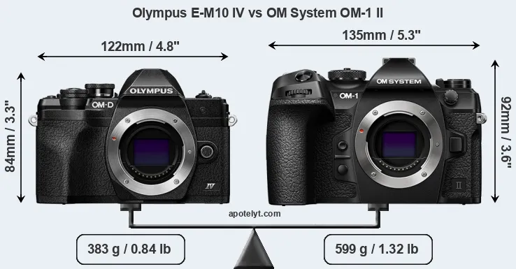 If the front view area (width x height) of the cameras is taken as an aggregate measure of their size, the OM System OM-1 II is notably larger (21 percent) than the Olympus E-M10 IV. Moreover, the OM-1 II is substantially heavier (56 percent) than the E-M10 IV. It is noteworthy in this context that the OM-1 II is splash and dust-proof, while the E-M10 IV does not feature any corresponding weather-sealing.