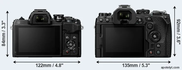 The side-by-side display below illustrates the physical size and weight of the Olympus E-M10 IV and the OM System OM-1 II. The two cameras are presented according to their relative size. Three consecutive perspectives from the front, the top, and the back are available. All size dimensions are rounded to the nearest millimeter.