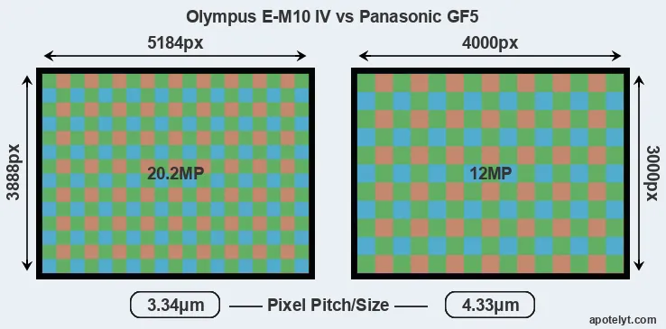 While the two cameras under review share the same sensor size, the E-M10 IV offers a higher resolution of 20.2 megapixels, compared with 12 MP of the GF5. This megapixels advantage translates into a 30 percent gain in linear resolution. On the other hand, these sensor specs imply that the E-M10 IV has a higher pixel density and a smaller size of the individual pixel (with a pixel pitch of 3.34μm versus 4.33μm for the GF5). In this context, it should be noted, however, that the E-M10 IV is much more recent (by 8 years and 4 months) than the GF5, and its sensor will have benefitted from technological advances during this time that compensate for the smaller pixel size. Coming back to sensor resolution, it should be mentioned that the E-M10 IV has no anti-alias filter installed, so that it can capture all the detail its sensor resolves.
