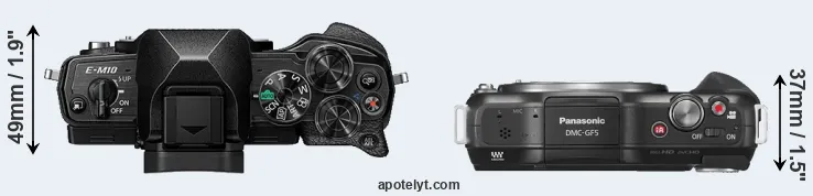 The side-by-side display below illustrates the physical size and weight of the Olympus E-M10 IV and the Panasonic GF5. The two cameras are presented according to their relative size. Three successive views from the front, the top, and the rear are shown. All width, height and depth measures are rounded to the nearest millimeter.