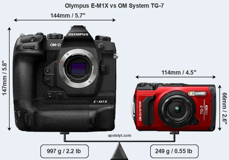 An illustration of the physical size and weight of the Olympus E-M1X and the OM System TG-7 is provided in the side-by-side display below. The two cameras are presented according to their relative size. Three successive views from the front, the top, and the rear are shown. All width, height and depth dimensions are rounded to the nearest millimeter.