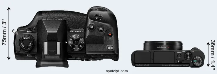 The side-by-side display below illustrates the physical size and weight of the Olympus E-M1X and the Sony HX95. The two cameras are presented according to their relative size. Three successive views from the front, the top, and the rear are shown. All width, height and depth dimensions are rounded to the nearest millimeter.
