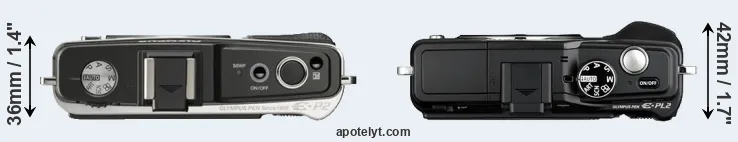The side-by-side display below illustrates the physical size and weight of the Olympus E-P2 and the Olympus E-PL2. The two cameras are presented according to their relative size. Three successive views from the front, the top, and the rear are shown. All size dimensions are rounded to the nearest millimeter.