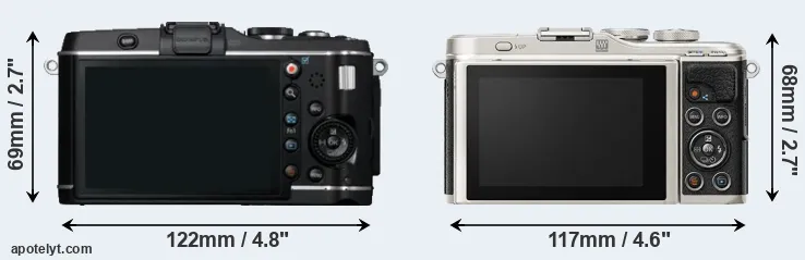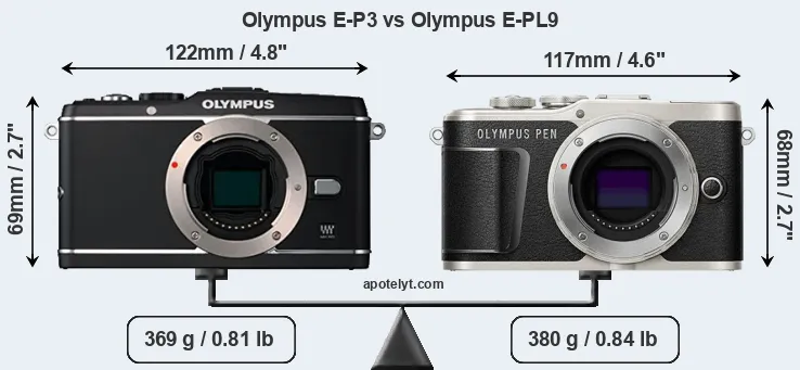 The side-by-side display below illustrates the physical size and weight of the Olympus E-P3 and the Olympus E-PL9. The two cameras are presented according to their relative size. Three consecutive perspectives from the front, the top, and the back are available. All width, height and depth dimensions are rounded to the nearest millimeter.