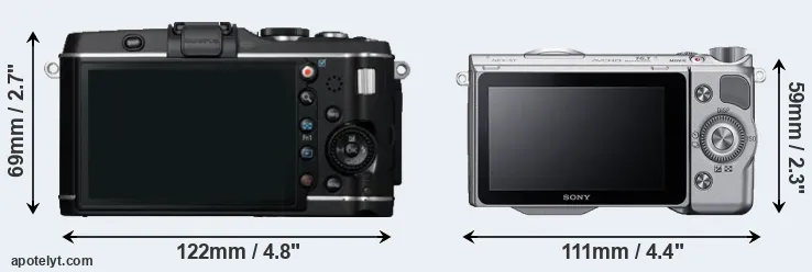 The side-by-side display below illustrates the physical size and weight of the Olympus E-P3 and the Sony NEX-5T. The two cameras are presented according to their relative size. Three consecutive perspectives from the front, the top, and the back are available. All width, height and depth dimensions are rounded to the nearest millimeter.