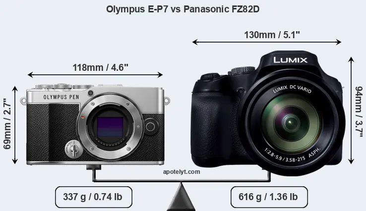 An illustration of the physical size and weight of the Olympus E-P7 and the Panasonic FZ82D is provided in the side-by-side display below. The two cameras are presented according to their relative size. Three successive views from the front, the top, and the rear are shown. All width, height and depth dimensions are rounded to the nearest millimeter.