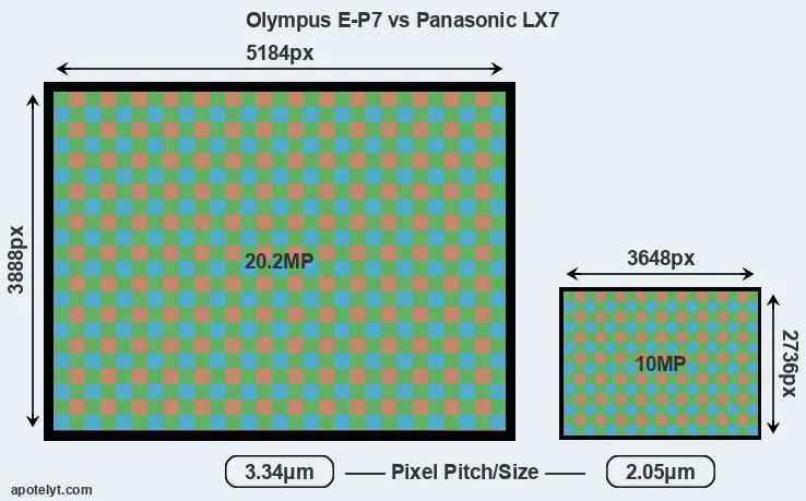 With 20.2MP, the E-P7 offers a higher resolution than the LX7 (10MP), but the E-P7 nevertheless has larger individual pixels (pixel pitch of 3.34μm versus 2.05μm for the LX7) due to its larger sensor. Moreover, the E-P7 is a much more recent model (by 8 years and 10 months) than the LX7, and its sensor will have benefitted from technological advances during this time that further enhance the light gathering capacity of its pixels.