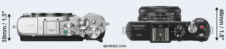 The physical size and weight of the Olympus E-P7 and the Panasonic LX7 are illustrated in the side-by-side display below. The two cameras are presented according to their relative size. Three successive views from the front, the top, and the rear are shown. All width, height and depth dimensions are rounded to the nearest millimeter.