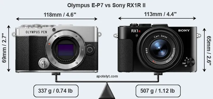 The above size and weight comparisons are to some extent incomplete and possibly misleading, as the RX1R II has a lens built in, whereas the E-P7 is an interchangeable lens camera that requires a separate lens. Attaching the latter will add extra weight and bulk to the setup. You can compare the optics available for the E-P7 and their specifications in the Micro Four Thirds Lens Catalog.