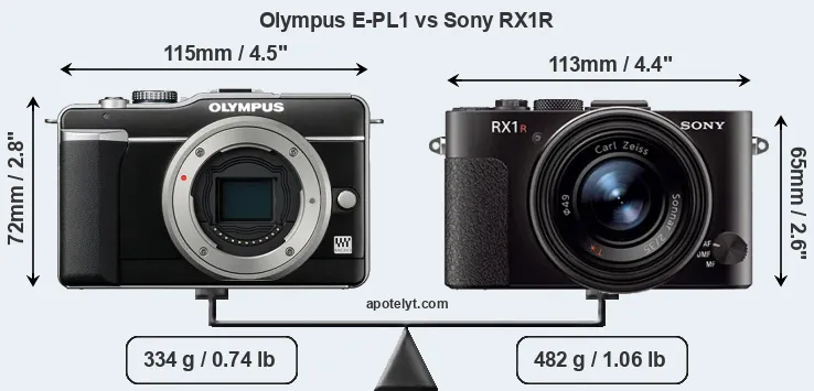 The side-by-side display below illustrates the physical size and weight of the Olympus E-PL1 and the Sony RX1R. The two cameras are presented according to their relative size. Three successive views from the front, the top, and the rear are shown. All width, height and depth measures are rounded to the nearest millimeter.