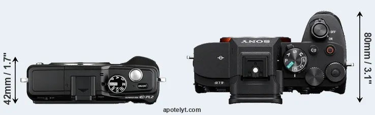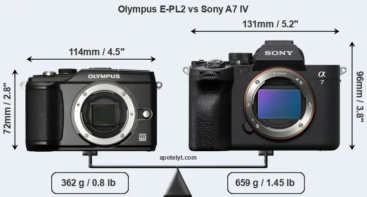 The physical size and weight of the Olympus E-PL2 and the Sony A7 IV are illustrated in the side-by-side display below. The two cameras are presented according to their relative size. Three consecutive perspectives from the front, the top, and the back are available. All width, height and depth dimensions are rounded to the nearest millimeter.