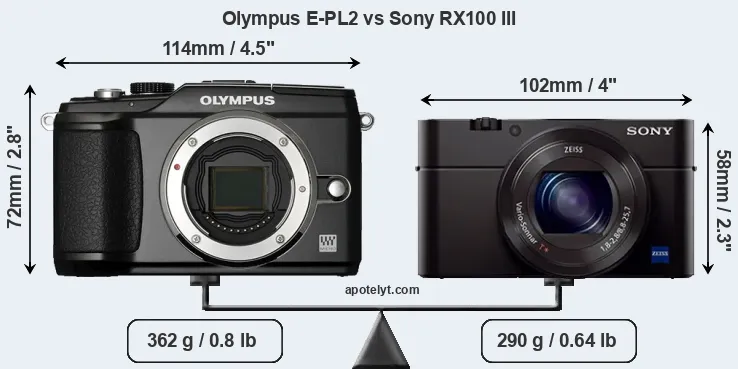 The side-by-side display below illustrates the physical size and weight of the Olympus E-PL2 and the Sony RX100 III. The two cameras are presented according to their relative size. Three successive views from the front, the top, and the rear are shown. All size dimensions are rounded to the nearest millimeter.