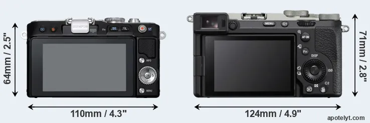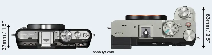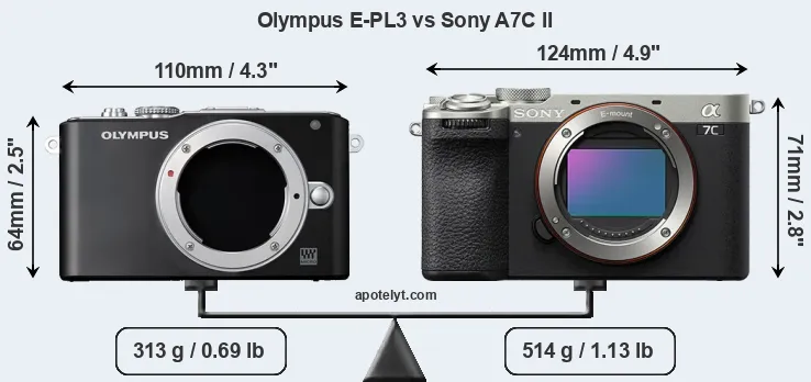 The side-by-side display below illustrates the physical size and weight of the Olympus E-PL3 and the Sony A7C II. The two cameras are presented according to their relative size. Three successive views from the front, the top, and the rear are shown. All width, height and depth dimensions are rounded to the nearest millimeter.
