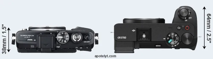 An illustration of the physical size and weight of the Olympus E-PL7 and the Sony A6700 is provided in the side-by-side display below. The two cameras are presented according to their relative size. Three consecutive perspectives from the front, the top, and the back are available. All width, height and depth dimensions are rounded to the nearest millimeter.