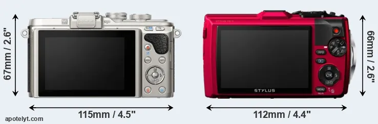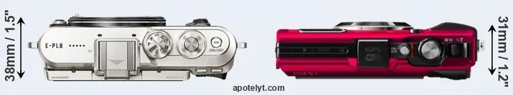 The side-by-side display below illustrates the physical size and weight of the Olympus E-PL8 and the Olympus TG-4. The two cameras are presented according to their relative size. Three consecutive views from the front, the top, and the rear side are shown. All size dimensions are rounded to the nearest millimeter.