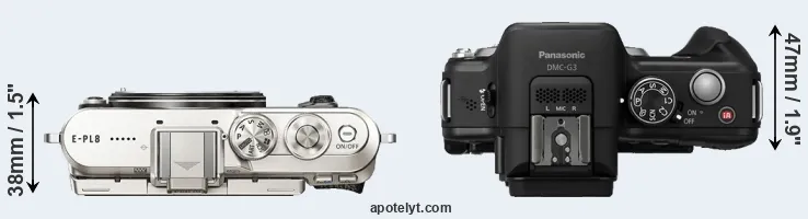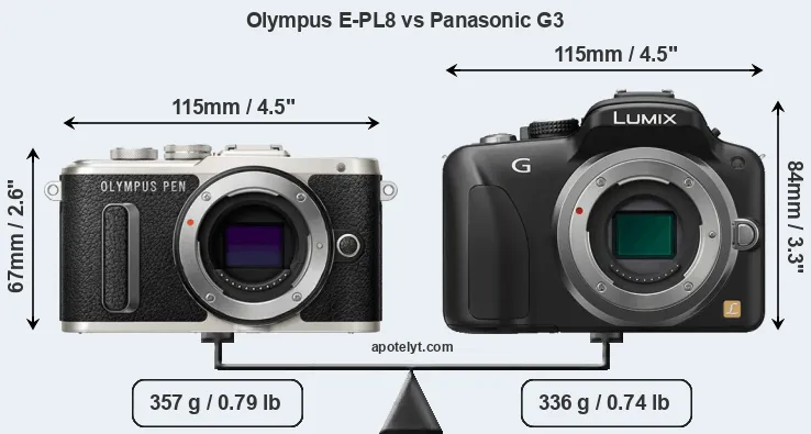 An illustration of the physical size and weight of the Olympus E-PL8 and the Panasonic G3 is provided in the side-by-side display below. The two cameras are presented according to their relative size. Three consecutive perspectives from the front, the top, and the back are available. All size dimensions are rounded to the nearest millimeter.