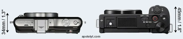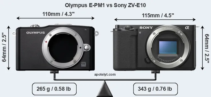 The side-by-side display below illustrates the physical size and weight of the Olympus E-PM1 and the Sony ZV-E10. The two cameras are presented according to their relative size. Three successive views from the front, the top, and the rear are shown. All width, height and depth measures are rounded to the nearest millimeter.