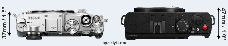 The physical size and weight of the Olympus PEN-F and the Panasonic S9 are illustrated in the side-by-side display below. The two cameras are presented according to their relative size. Three consecutive views from the front, the top, and the rear side are shown. All size dimensions are rounded to the nearest millimeter.