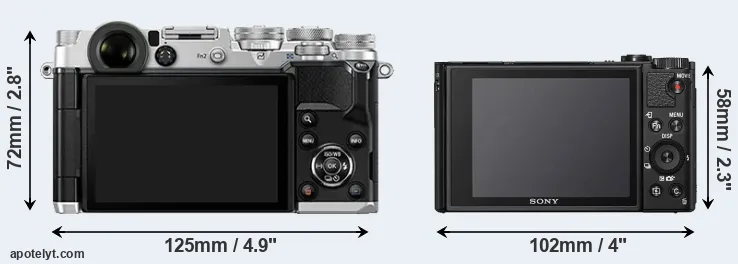 The physical size and weight of the Olympus PEN-F and the Sony HX99 are illustrated in the side-by-side display below. The two cameras are presented according to their relative size. Three successive views from the front, the top, and the rear are shown. All width, height and depth dimensions are rounded to the nearest millimeter.