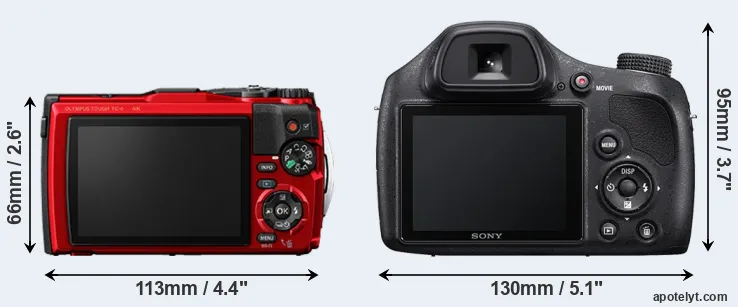 The side-by-side display below illustrates the physical size and weight of the Olympus TG-6 and the Sony H400. The two cameras are presented according to their relative size. Three consecutive perspectives from the front, the top, and the back are available. All width, height and depth dimensions are rounded to the nearest millimeter.