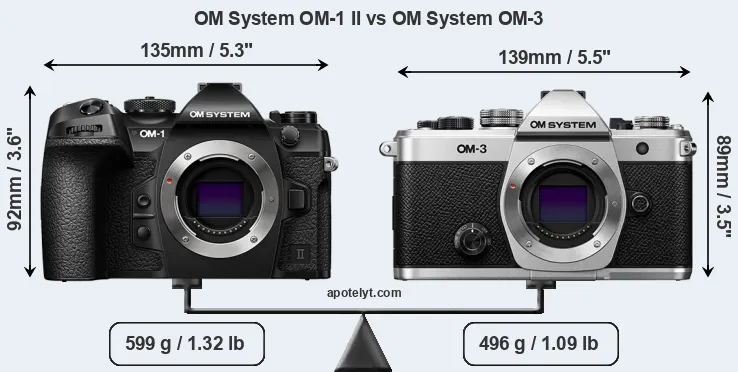 An illustration of the physical size and weight of the OM System OM-1 II and the OM System OM-3 is provided in the side-by-side display below. The two cameras are presented according to their relative size. Three successive views from the front, the top, and the rear are shown. All size dimensions are rounded to the nearest millimeter.