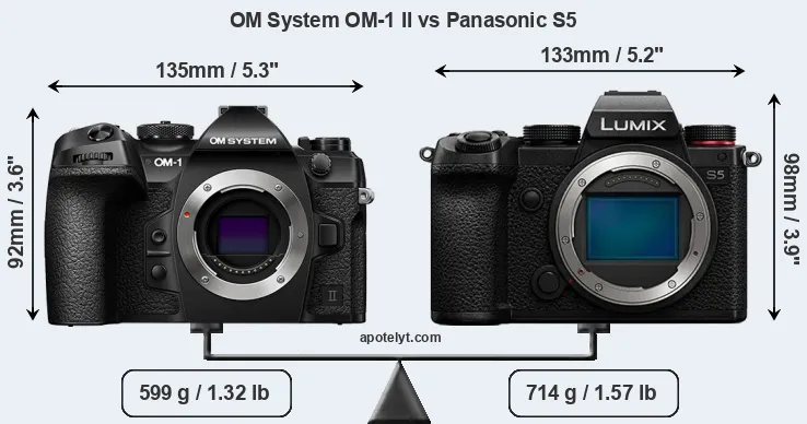 If the front view area (width x height) of the cameras is taken as an aggregate measure of their size, the Panasonic S5 is somewhat larger (5 percent) than the OM System OM-1 II. Moreover, the S5 is markedly heavier (19 percent) than the OM-1 II. In this context, it is worth noting that both cameras are splash and dust-proof and can, hence, be used in inclement weather conditions or harsh environments.