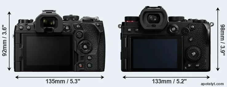 The side-by-side display below illustrates the physical size and weight of the OM System OM-1 II and the Panasonic S5. The two cameras are presented according to their relative size. Three consecutive perspectives from the front, the top, and the back are available. All width, height and depth measures are rounded to the nearest millimeter.