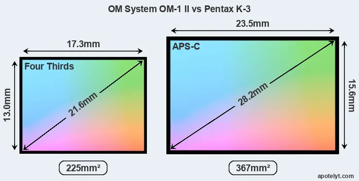Of the two cameras under consideration, the OM System OM-1 II features a Four Thirds sensor and the Pentax K-3 an APS-C sensor. The sensor area in the K-3 is 63 percent bigger. As a result of these sensor size differences, the cameras have a format factor of, respectively, 2.0 and 1.5. The sensor in the OM-1 II has a native 4:3 aspect ratio, while the one in the K-3 offers a 3:2 aspect.