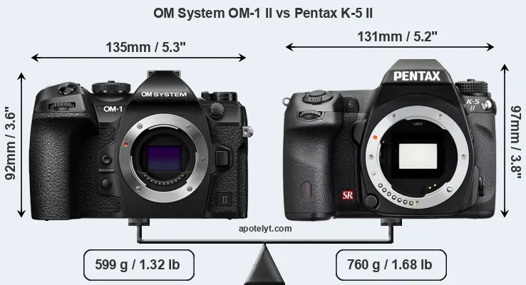 An illustration of the physical size and weight of the OM System OM-1 II and the Pentax K-5 II is provided in the side-by-side display below. The two cameras are presented according to their relative size. Three consecutive views from the front, the top, and the rear side are shown. All width, height and depth dimensions are rounded to the nearest millimeter.