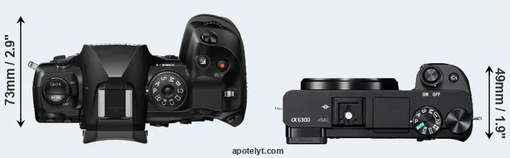 The physical size and weight of the OM System OM-1 II and the Sony A6300 are illustrated in the side-by-side display below. The two cameras are presented according to their relative size. Three successive views from the front, the top, and the rear are shown. All width, height and depth measures are rounded to the nearest millimeter.
